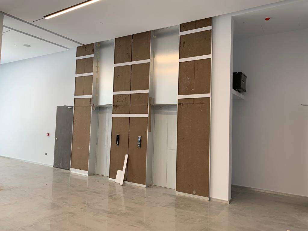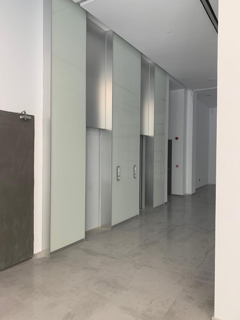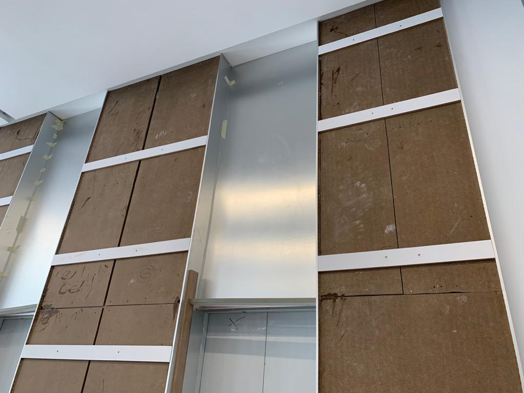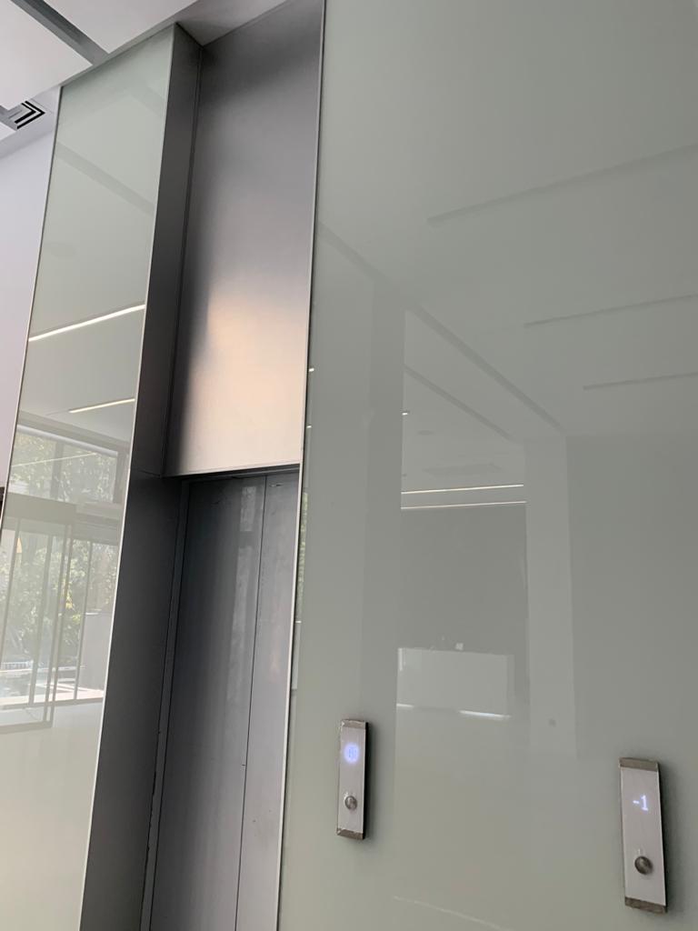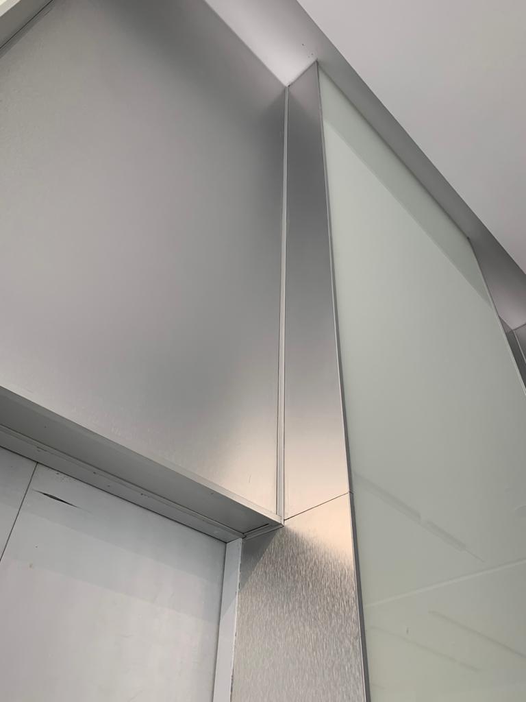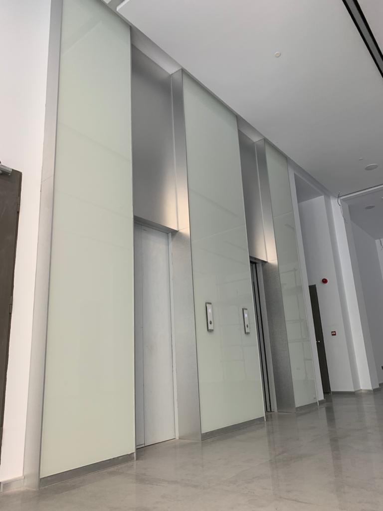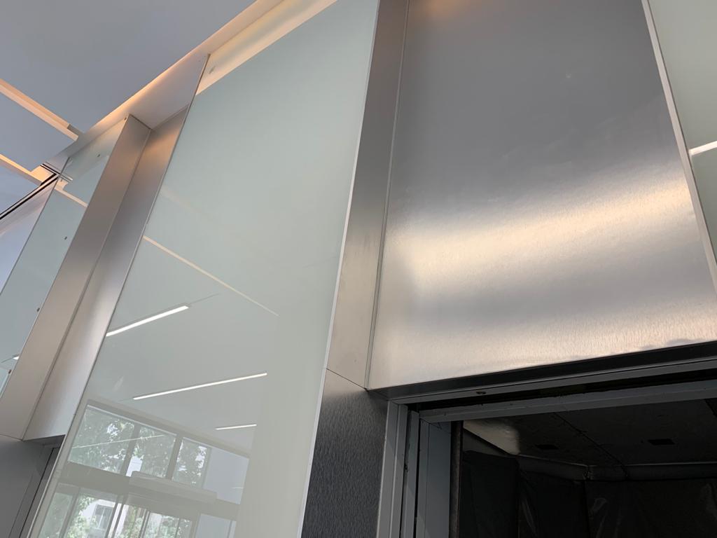 اجرای دیوار نمای دور آسانسور با جنس استیل و شیشه